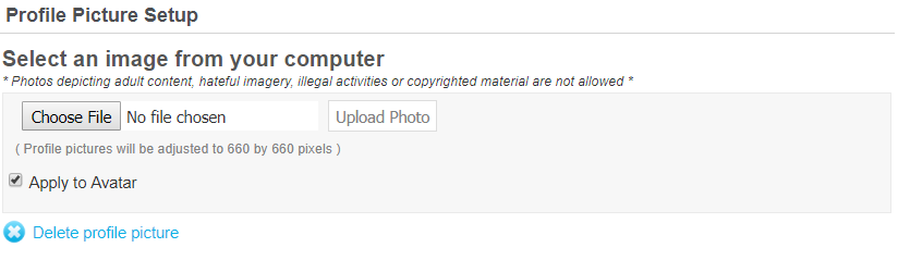 - On this page you will locate the section that states "Profile Picture Setup" and select the You will click in the box that states "Choose File" and select the image; once you have selected the image you would like to use, you will click the button "Upload Photo"