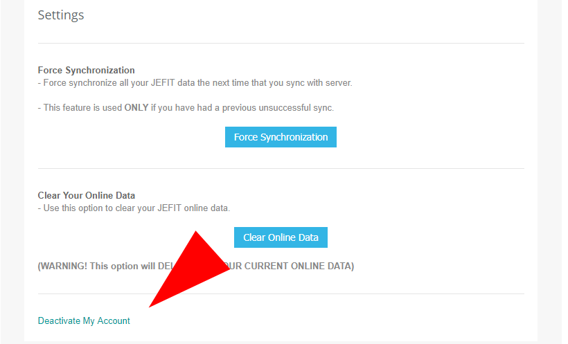- From the setting page you will scroll down on the page until you see the section labeled "Settings" and will want to click on the "Deactivate My Account" button to initiate the deletion of your JEFIT Account.